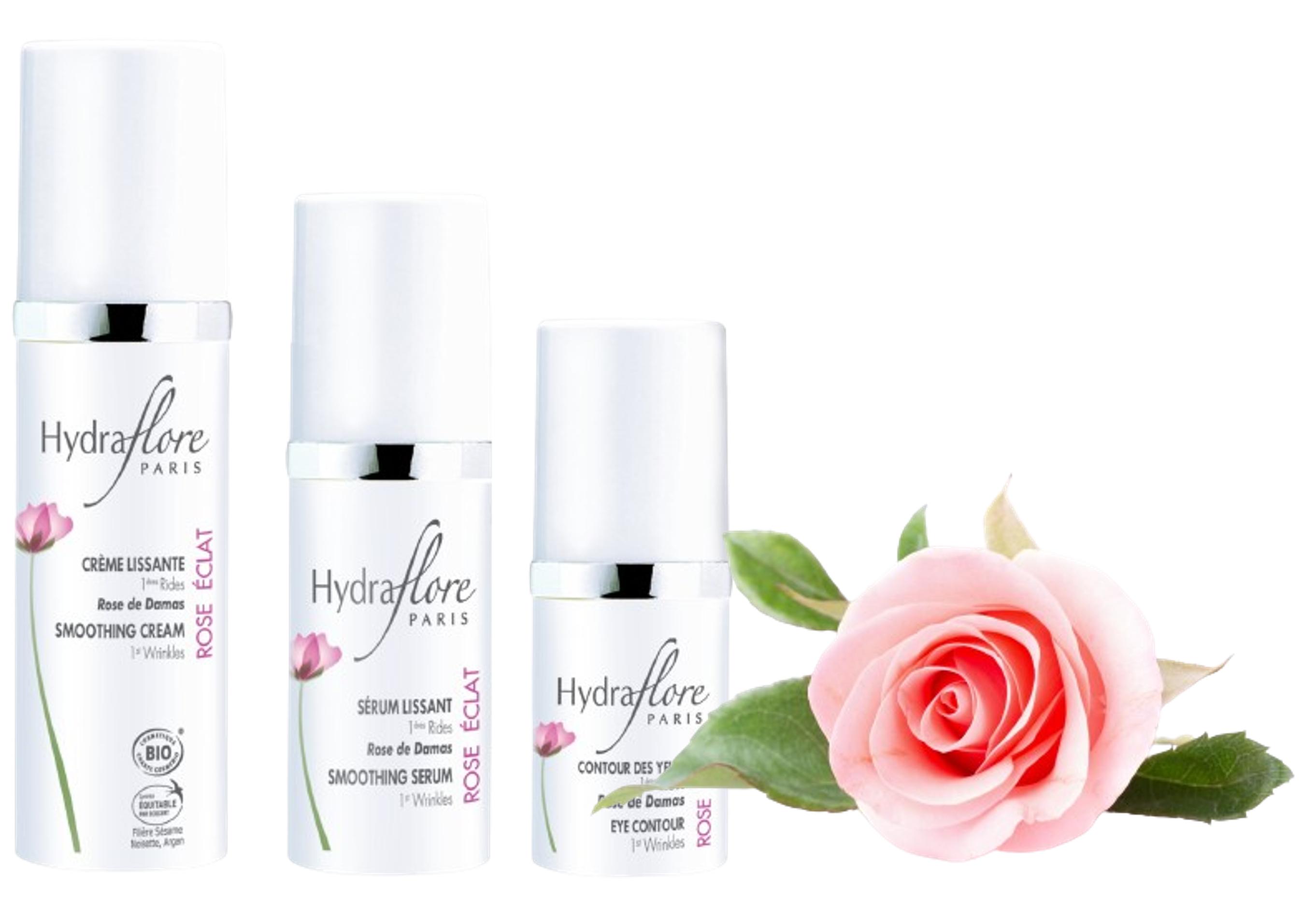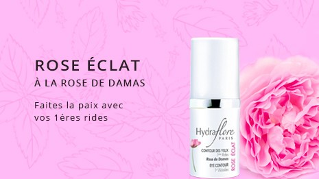 The organic Hydraflore Rose Eclat range with Damascus Rose was designed to preserve the radiance and youthfulness of the skin from the age of 30. The range consists of 3 products formulated around the anti-aging properties of Damask Rose. Smoothing Cream, Smoothing Serum and an Eye Contour. Thanks to carefully selected powerful active ingredients, these three products, with complementary actions, guarantee visible results by acting on the radiance of the complexion, the hydration of the epidermis and the tone of the skin.
