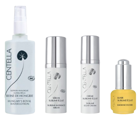 Discover the 4 complementary products of the Radiance Range to restore for tired skin natural radiant complexion. Formulated to Act Efficiently, this Centella range soothes and revitalizes dull and weathered skin types. Hungary Water Royal Lotion rich in Rosemary, mantles the skin in a fine, fresh mist. Radiance Serum and Elixir, will tone and subtly the skin while bringing it a soothing effect. Product formulations improve hydration and provide an immediate freshness effect.