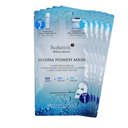 The Hydrating mask comes in one sachet-package with 3 ml Hyaluronic Serum and 3 ml Hyaluronic Cream – as following steps 2 and 3 in facial treatment.
